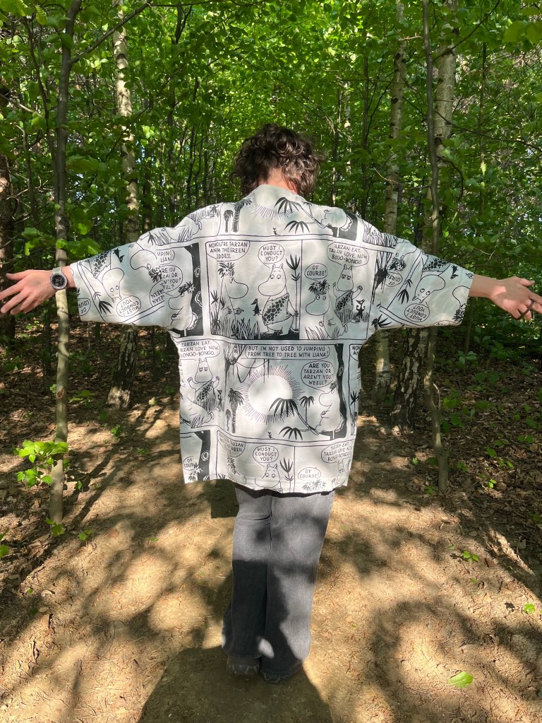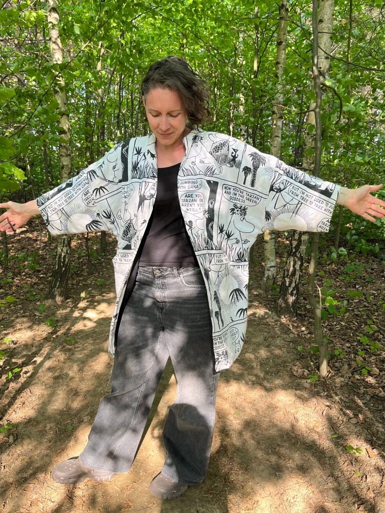 On one of my foraging trips to the second-hand shop, I spotted a single solitary Moomin comic strip curtain. Immediately, I thought: Nova coat. But then, budget panic and general second-guessing kicked in: Was it enough fabric? Was I being impractical?