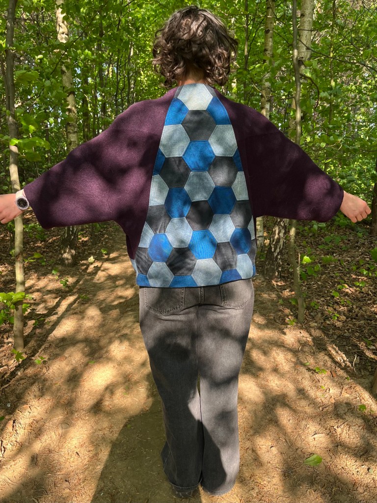 I patchworked enough denim hexagons to use on the bottom front and back of the coat, so the patchwork sections meet and visually wrap around the sides. I love the way the patchwork sections look… but this coat turned into a series of sewing compromises.