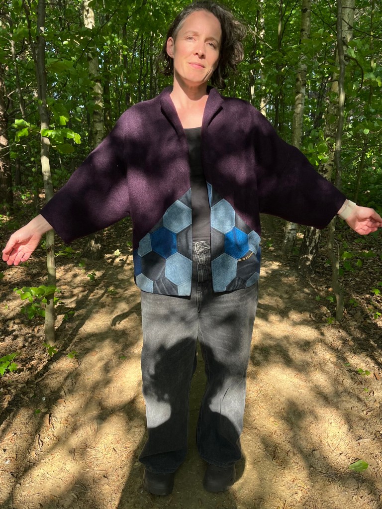 My mum gifted me a piece of dark purple coat-weight fabric — but there wasn’t enough for even the short version. I considered pairing it with minty blue-green wool for a “choc-chip” look, but a pile of old jeans in the corner caught my eye and imagination.